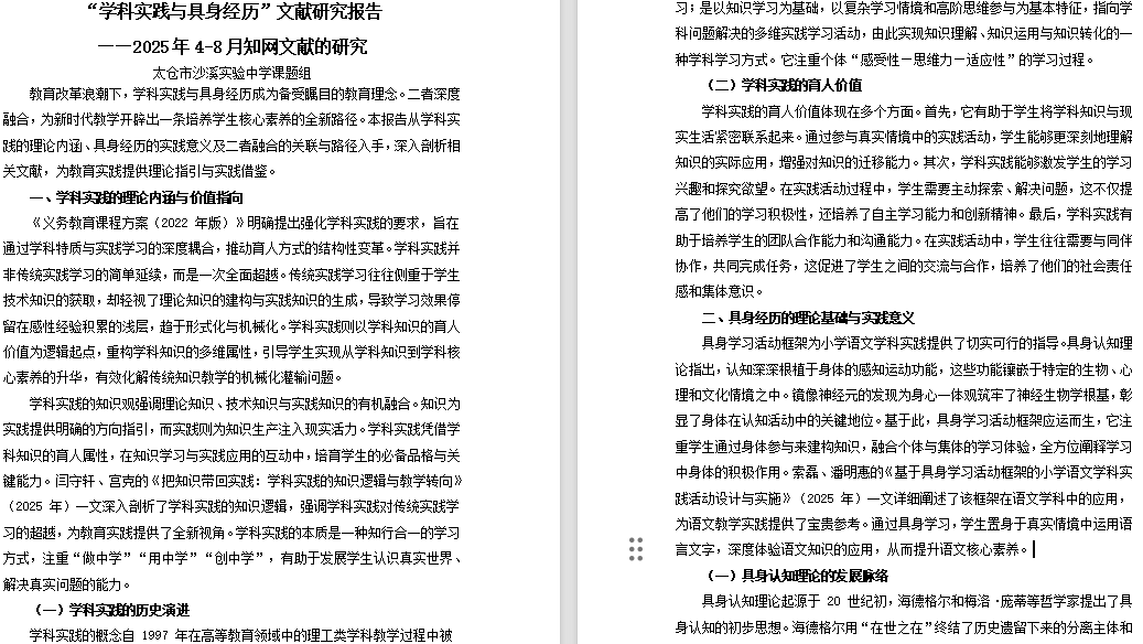“学科实践与具身经历”文献研究报告——2025年4-8月知网文献的研究