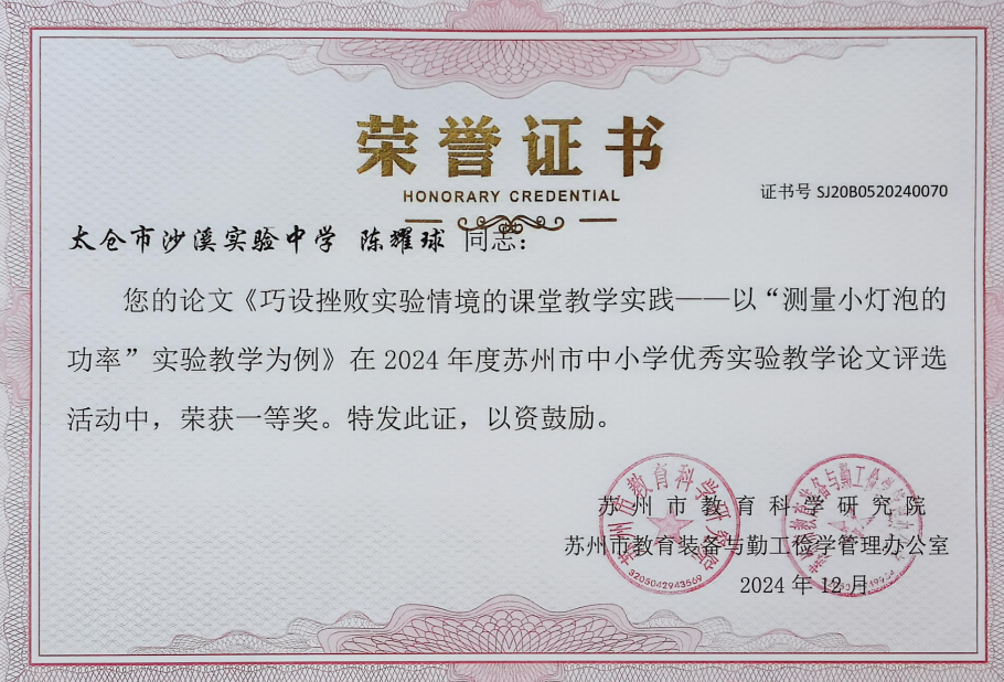 课题论文《巧设挫败实验情境的课堂教学实践——以“测量小灯泡的功率”实验教学为例》获苏州市一等奖