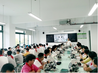(1)课堂观摩:科教融合,实践研究。周哲史老师在数码显微镜实验室执教课题研究课《认识与使用双目显微镜》。周老师围绕江苏省教育科学“十四五”规划课题“依托智慧实验室创新初中理科实践教学的行动研究”,精心设计并实施了本课的教学。首先,周老师组织学生通过观察对比单目显微镜和双目显微镜,引导学生认识显微镜的结构,找出单目显微镜和双目显微镜的不同,明晰双目显微镜的特点与优势。然后,周老师引导学生亲身操作双目显微镜观察各种载玻片,观察不同倍数下的动植物的细胞大小与特征,通过体验实践,使学生学会使用双目显微镜。本课生动展现了学校省规划课题研究成果,为初中理科实践教学提供了创新范式,受到了学生的喜爱和专家团队的高度评价,也为课题组教师提供了示范案例。