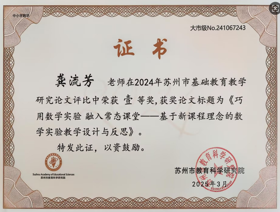 课题论文《巧用数学实验融入常态课堂——一基于新课程理念的数学实验教学设计与反思》获苏州市一等奖