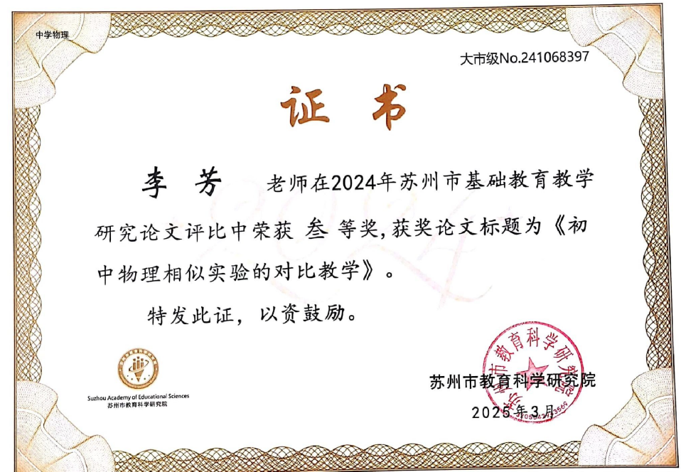 课题论文《初中物理相似实验的对比教学》获苏州市三等奖