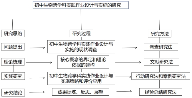 其研究内容,包括作业设计和作业实施。作业设计围绕如何将生物学知识与物理、化学、地理、数学等学科知识有机结合,设计出具有跨学科性质的实践作业;探索制作类作业、调查类作业、探究类作业、专题类作业等不同类型的跨学科实践作业的设计方法和原则。作业实施围绕研究如何在课堂教学中有效实施跨学科实践作业,包括教学策略、组织形式、资源利用等;以及分析学生在完成跨学科实践作业过程中的表现和学习效果。