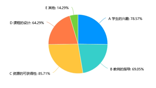 在所有选项中,85.71%的受访者认为资源的可获得性对跨学科实践作业的有效性影响最大。这表明,确保学生能够获取必要的资源是提高作业效果的关键。