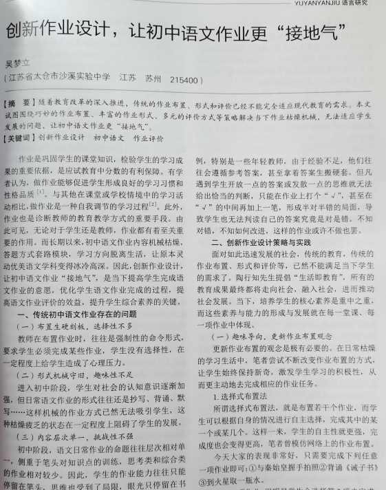 课题论文《创新作业设计,让初中语文作业更“接地气”》发表于《作家天地》